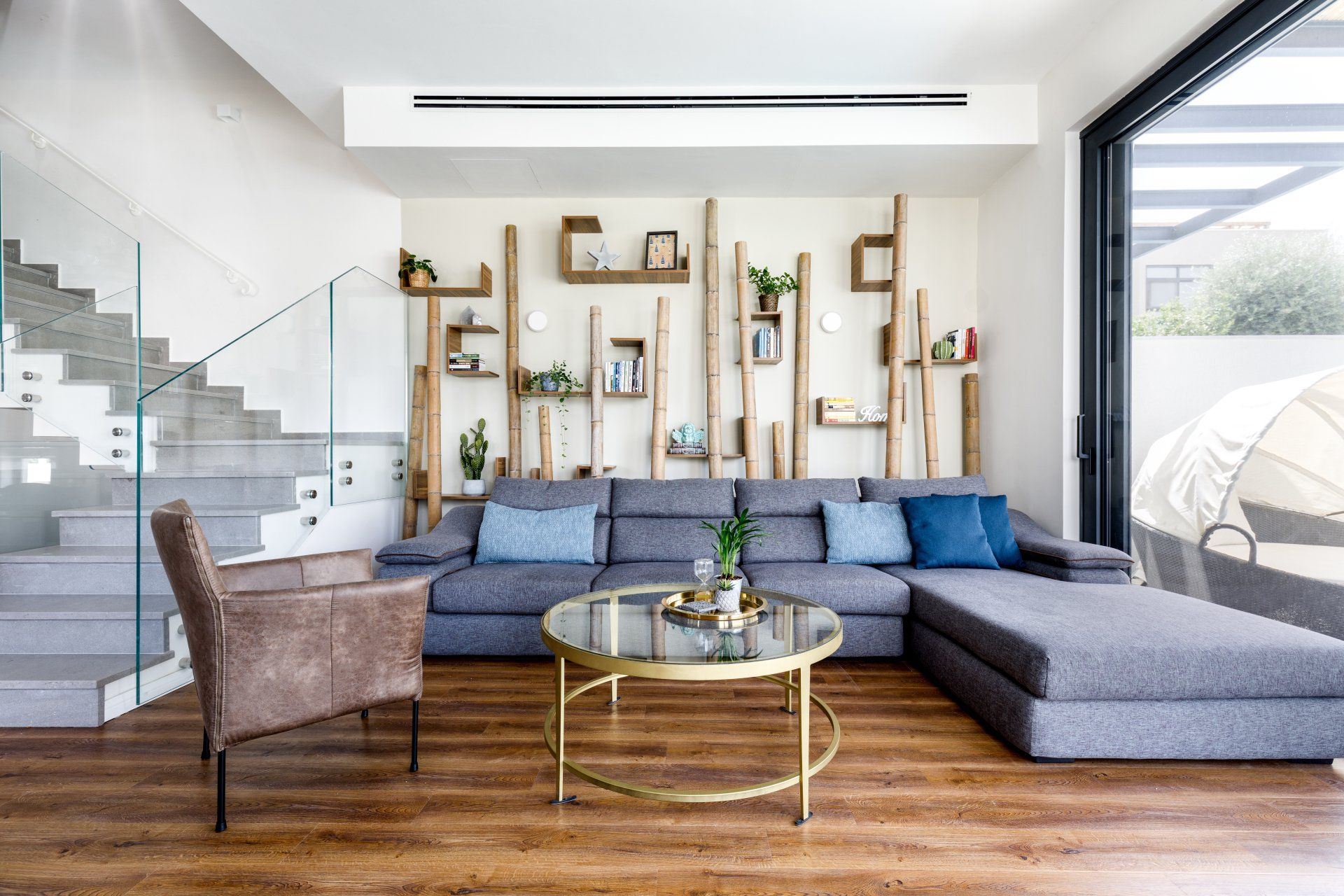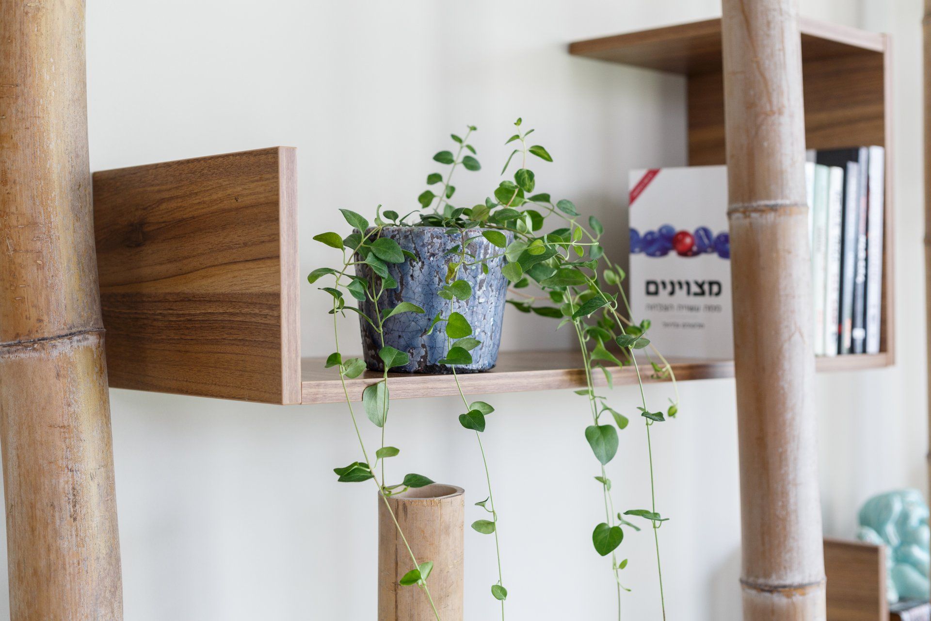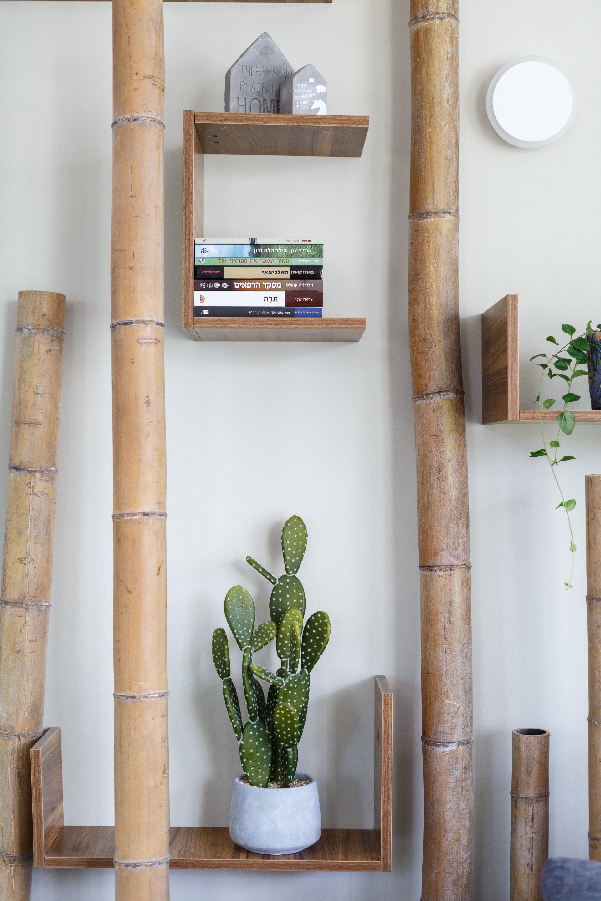 בגב אזור הישיבה בסלון ספרייה מיוחדת במינה המשלבת מוטות במבוק בגבהים משתנים ותיבות עץ תלויות על הקיר.