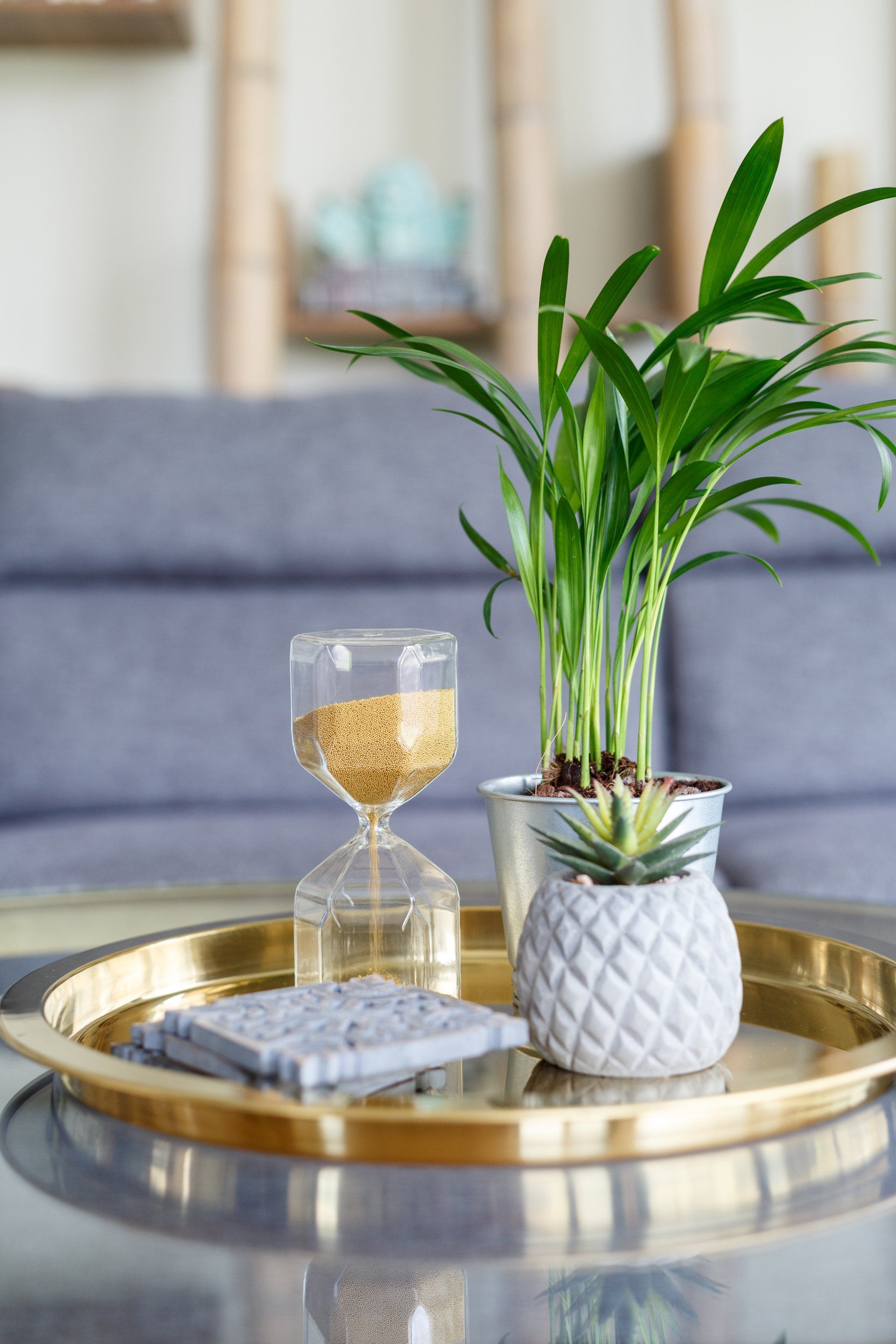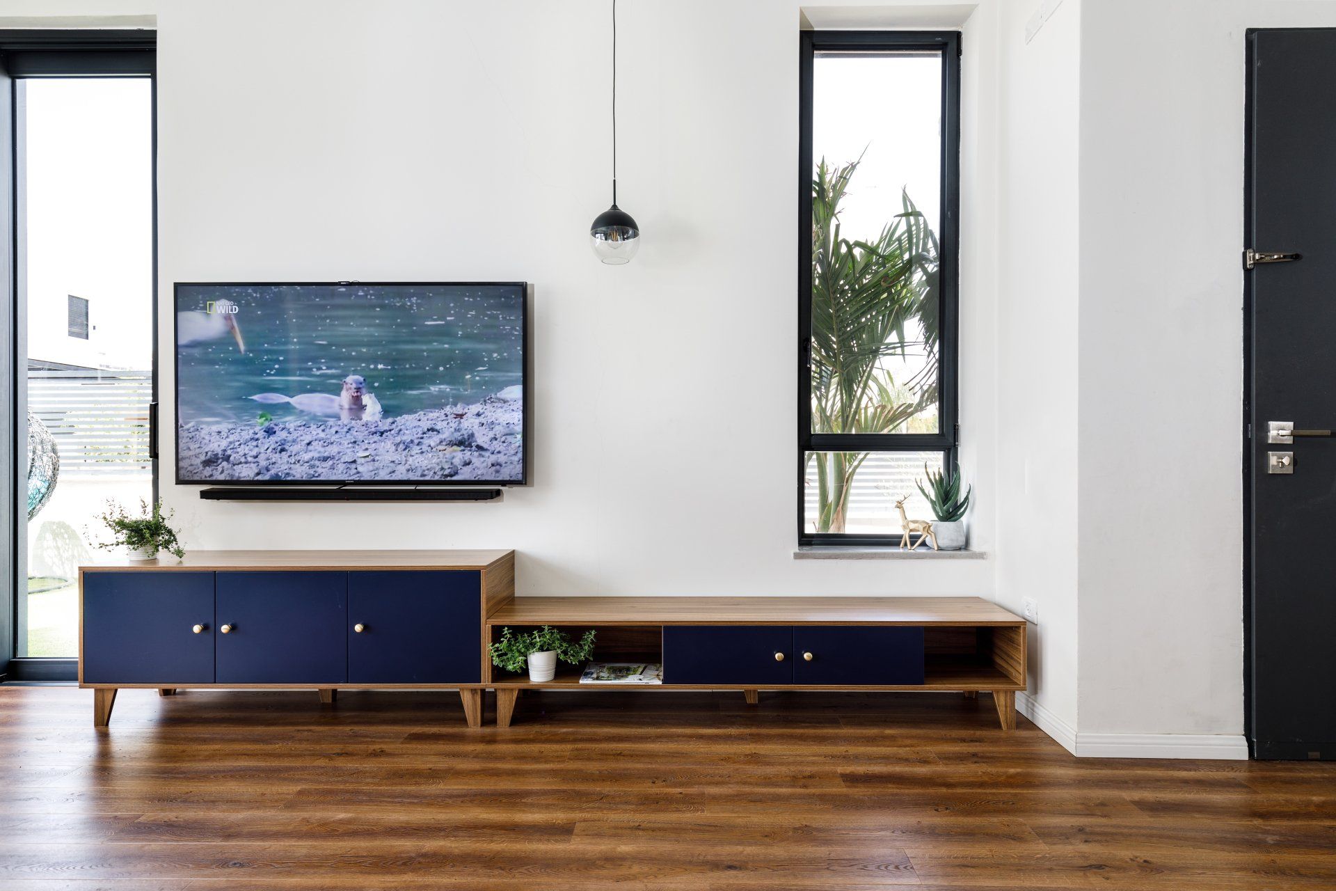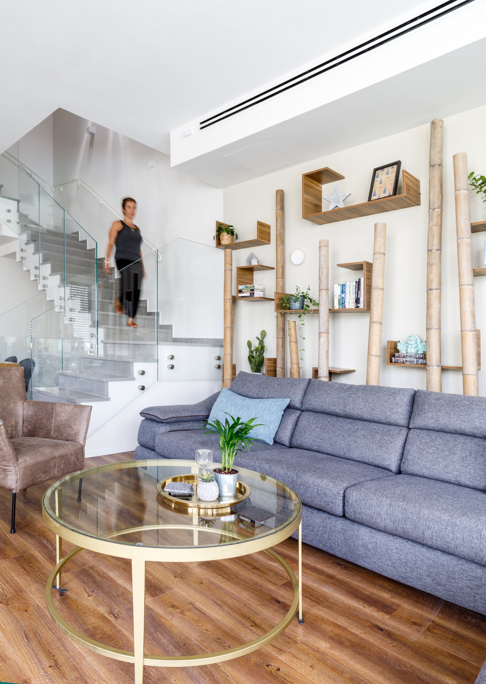 בגב אזור הישיבה בסלון ספרייה מיוחדת במינה המשלבת מוטות במבוק בגבהים משתנים ותיבות עץ תלויות על הקיר.
