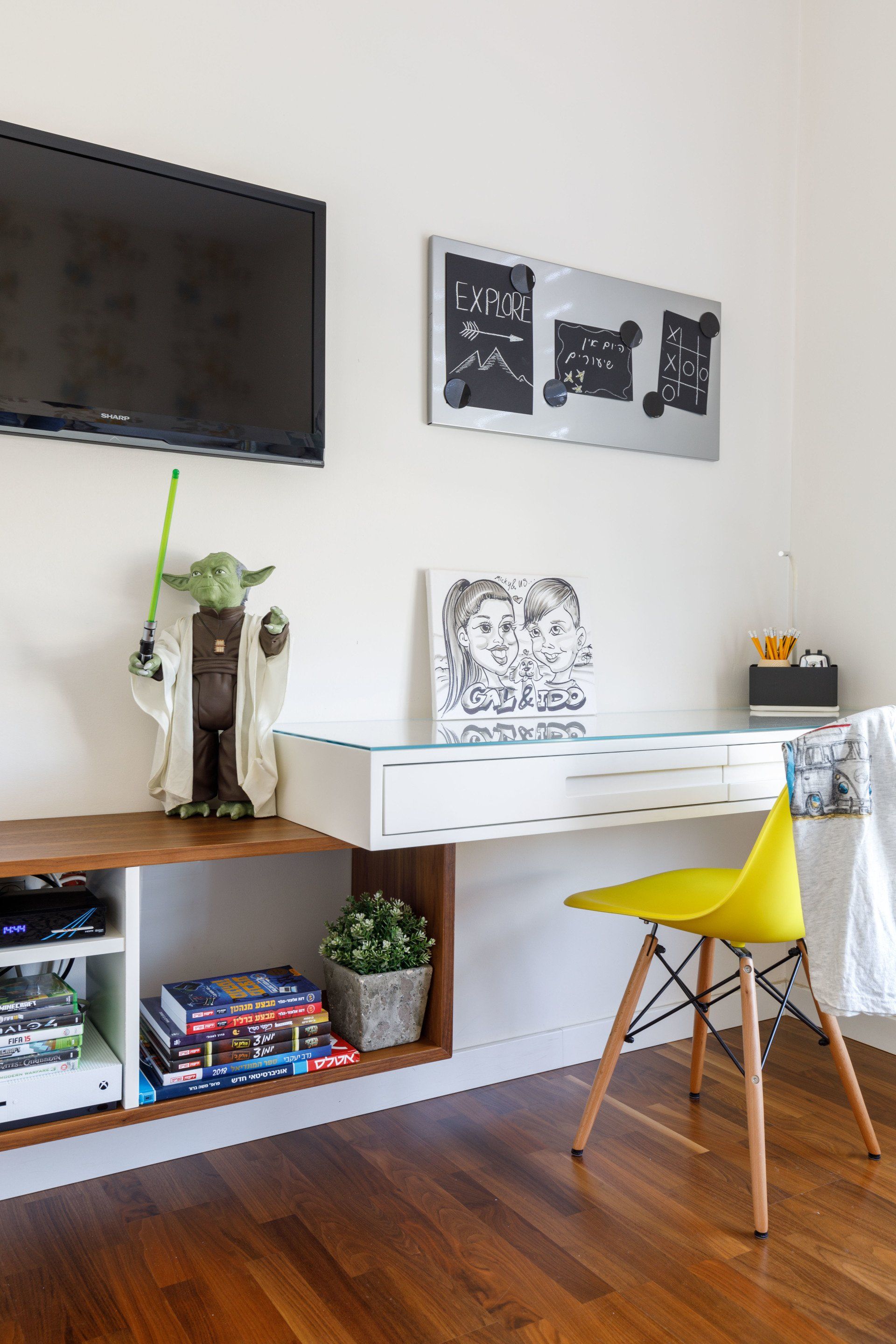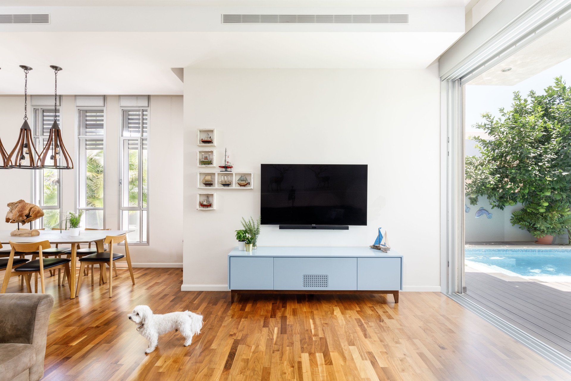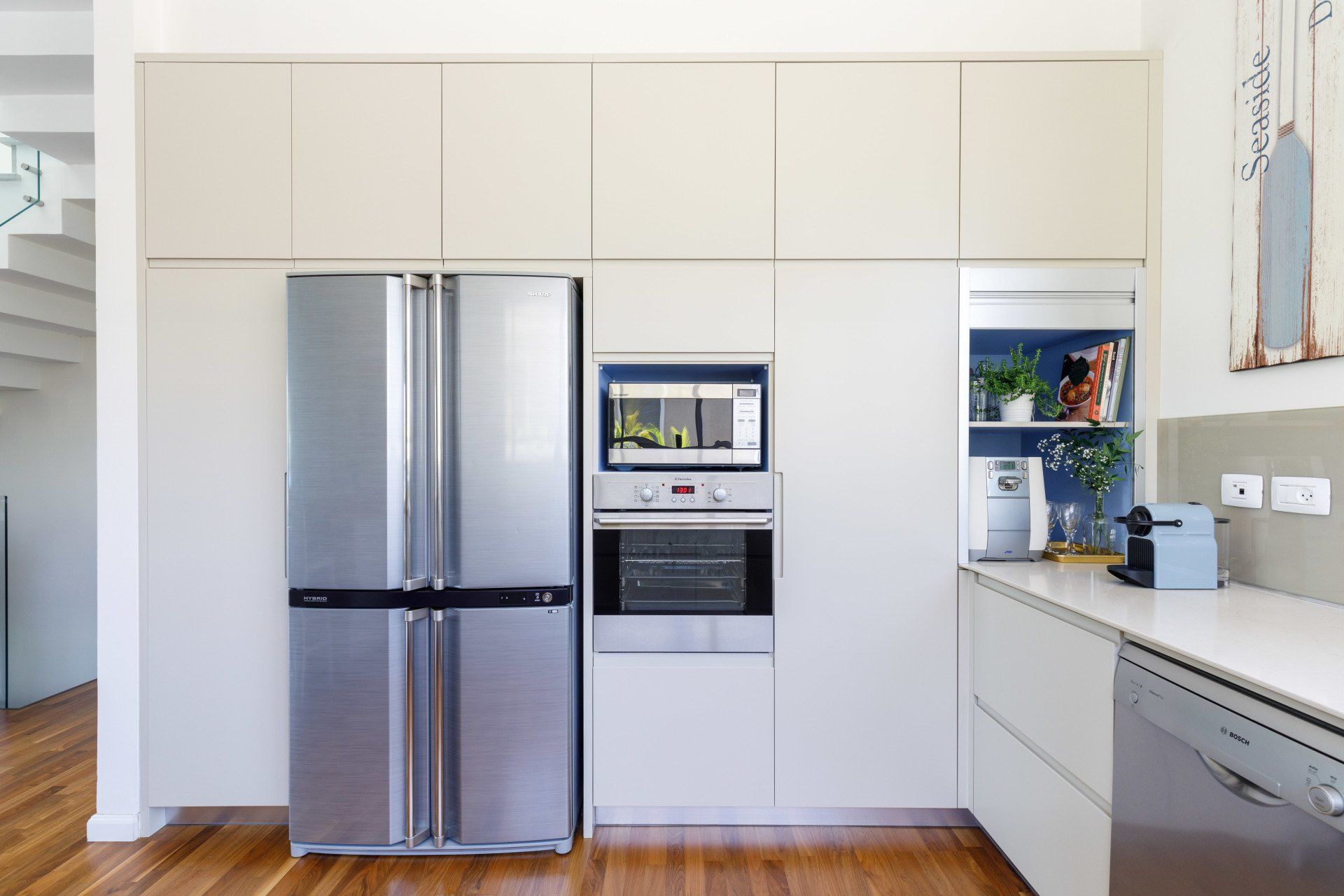 תכנון דו משפחתי על שטח של 310 מר' בשלושה מפלסים לזוג + 2 ילדים. החלל הציבורי מחולק לשלושה אזורים מוגדרים, הספרייה בצמוד למדרגות מדגישה את גובה החלל . פלטת הצבעים והחומרים מורכבת מגווני קפה, כחול-תכלת ועץ.