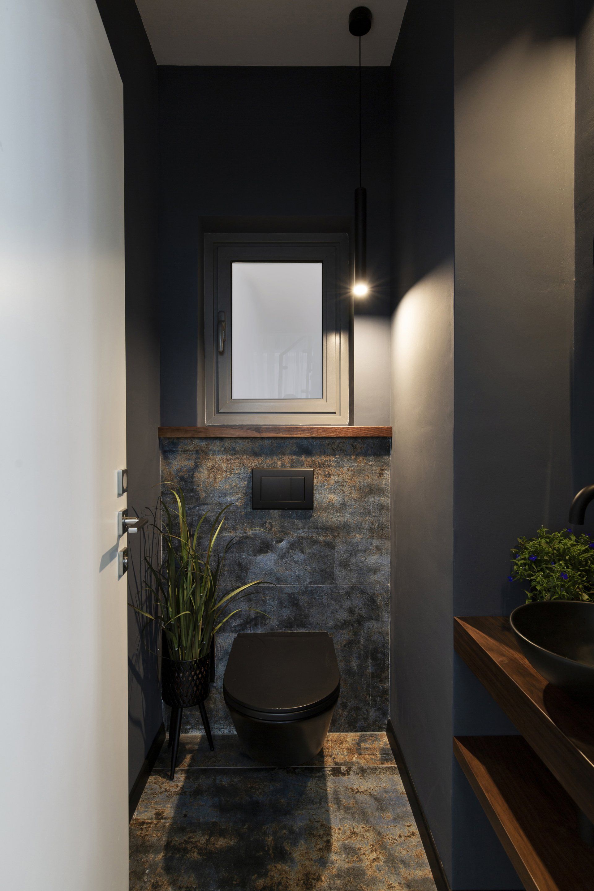 מטבח בעיצוב מודרני בגוון אפור פלדה עמוק בשילוב שיש בהיר ונישה מחופה עץ אלון מחורץ. מהמטבח כניסה למשרד ביתי אותו חולקים בני הזוג.